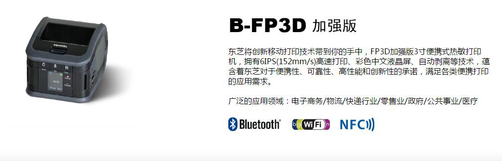 東芝將創(chuàng)新移動(dòng)打印技術(shù)帶到你的手中,F(xiàn)P3D加強(qiáng)版3寸便攜式熱敏打印機(jī),擁有6IPS(152mm/s)告訴打印、彩色中文液晶屏、自動(dòng)剝離等技術(shù)
