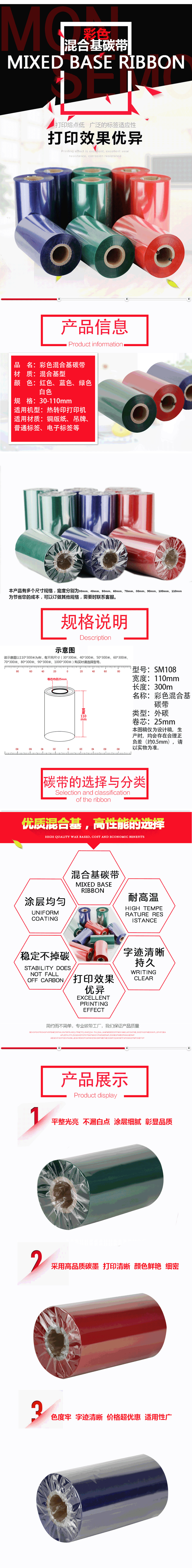 產品名稱 : 彩色混合基碳帶 40 50 60 70 80 90 100 110 300M 紅色 藍色綠色等可定做規(guī)格