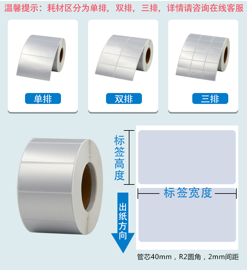 材質(zhì):啞銀標(biāo)簽紙 膠水:水膠 規(guī)格:單排 雙排 三排 四排 打印方式:熱轉(zhuǎn)印打印 搭配碳帶:需要碳帶 實(shí)用機(jī)型:有熱轉(zhuǎn)印打印機(jī)功能的打印機(jī) 應(yīng)用范圍:廣泛應(yīng)用于超市,餐飲,酒店,銀行,電信,醫(yī)療等各個(gè)行業(yè)
