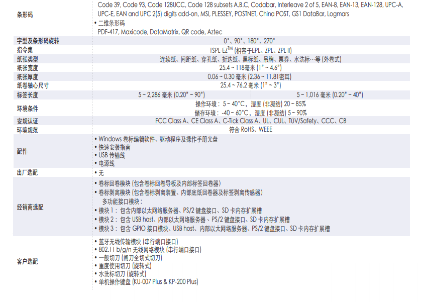 多款選購(gòu)配件:內(nèi)建式乙太網(wǎng)路伺服器、USB host 可搭配鍵盤(pán)或掃描器、標(biāo)簽剝離模組、標(biāo)簽回卷模組